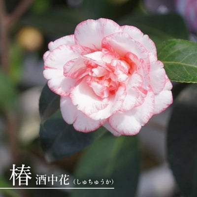 酒中花(しゅちゅうか)は、白と覆輪の配色が鮮やかな椿です。牡丹咲きで中輪。