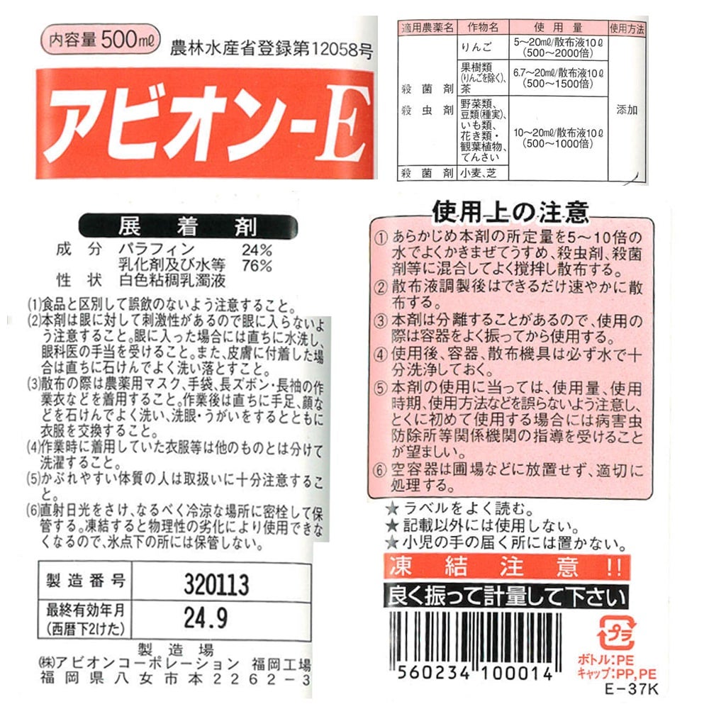 他の画像を見る JAS適合資材 薬剤散布を効果的に! 病害虫の発生を低下させる! 【 展着剤 】 アビオンE ( パラフィン 展着剤 ) 500ml バラ 果樹苗 全般 花木類 乳化剤 価格 ¥ 1,518 税込 お気に入りに登録する (0)