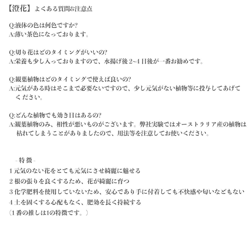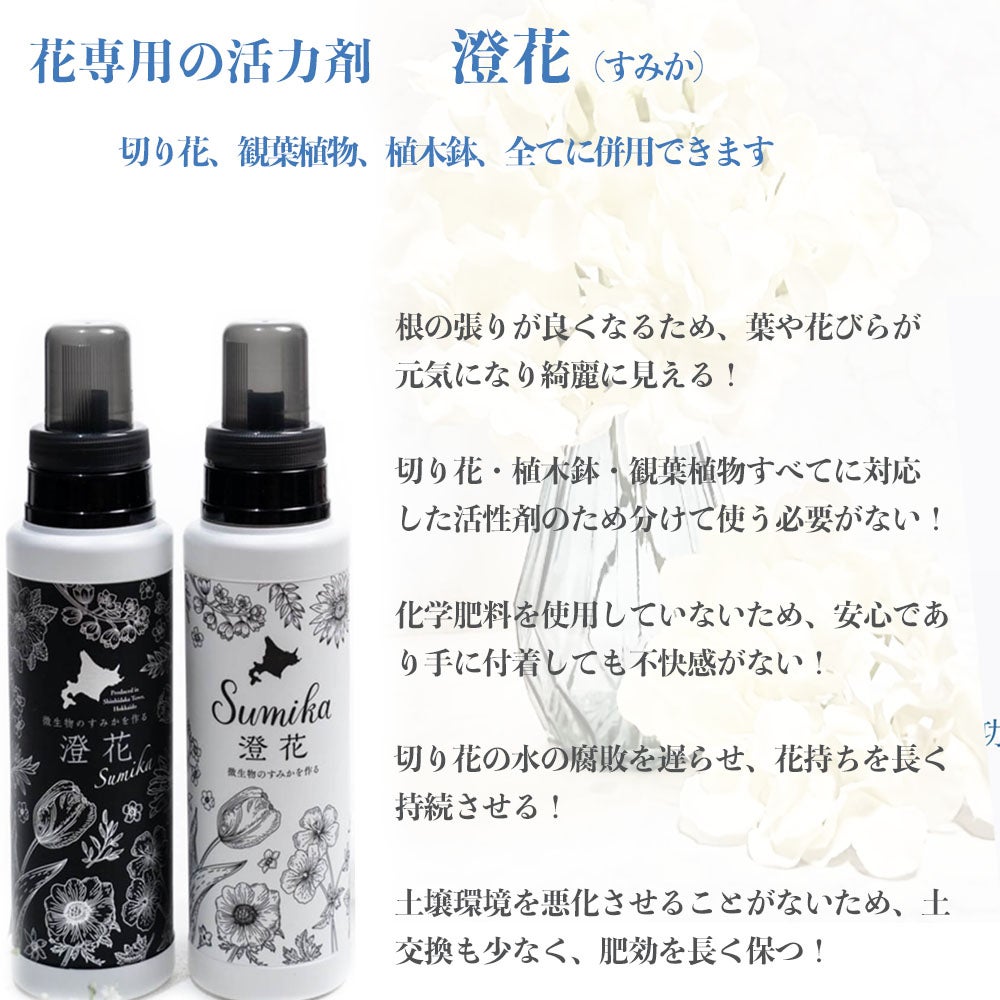 他の画像を見る 切り花、観葉植物、鉢植えや花壇に使用可能。花専用の活力剤。 花の活力剤 【澄花 (すみか)】 400ml 3本セット 花専用の万能活性剤 メーカー直送 代引き不可 沖縄県・離島の場合(1000円/個)の送料がかかります。 価格 ¥ 4,279 税込 詳細を見る お気に入りに登録する (0)