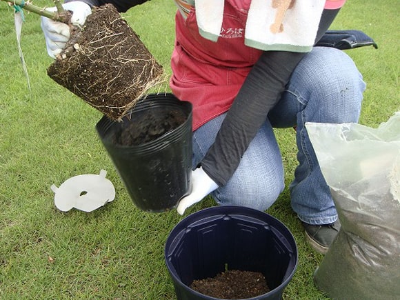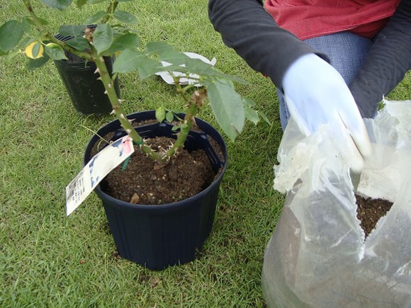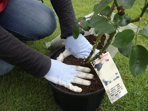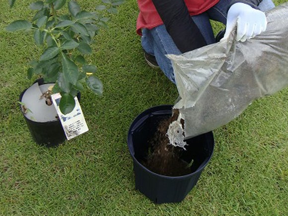 植物が安定して風揺れや根が付いた土と、「バラの土」が馴染みます。