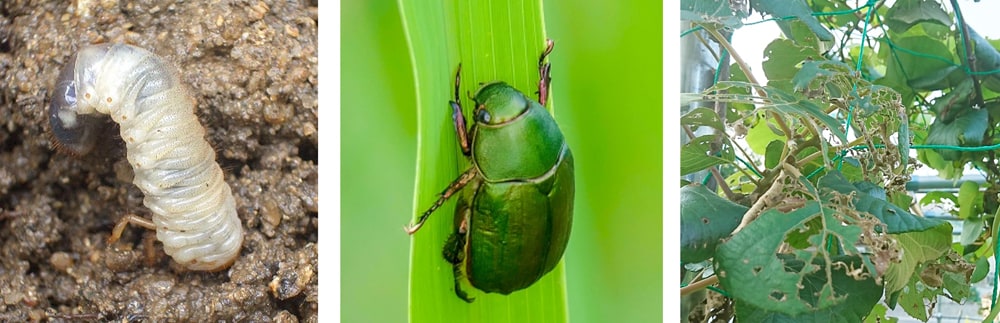 (左)コガネムシの幼虫 (中央)コガネムシの成虫 (右)成虫による葉の食害
