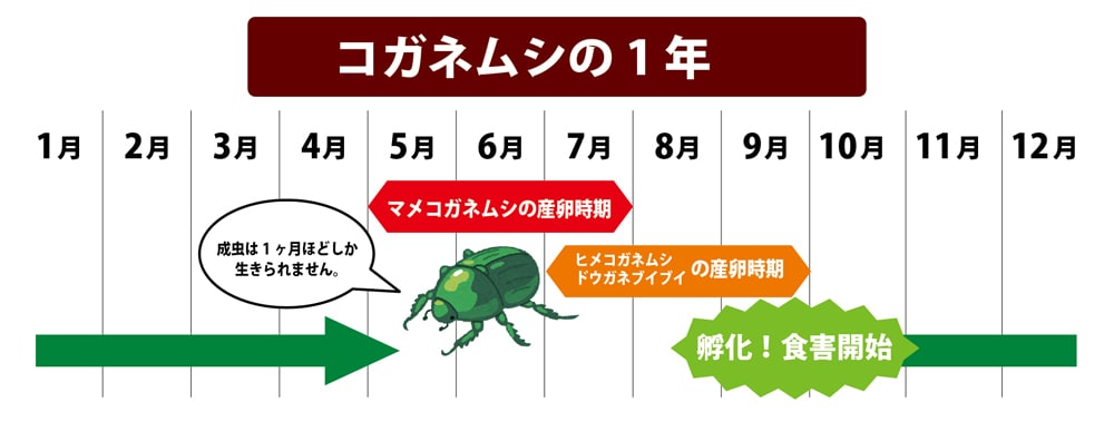 そして、8月末頃に卵から孵った幼虫が根っこを食べ始めます。コガネムシは飛来して産卵するため、農薬などの薬剤で産卵防止はできません。