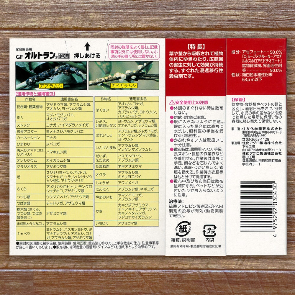有効成分:アセフェート 商品データ:農林水産省登録第21819号 性状:類白色水和性粉末63μm以下 剤型:水和剤