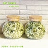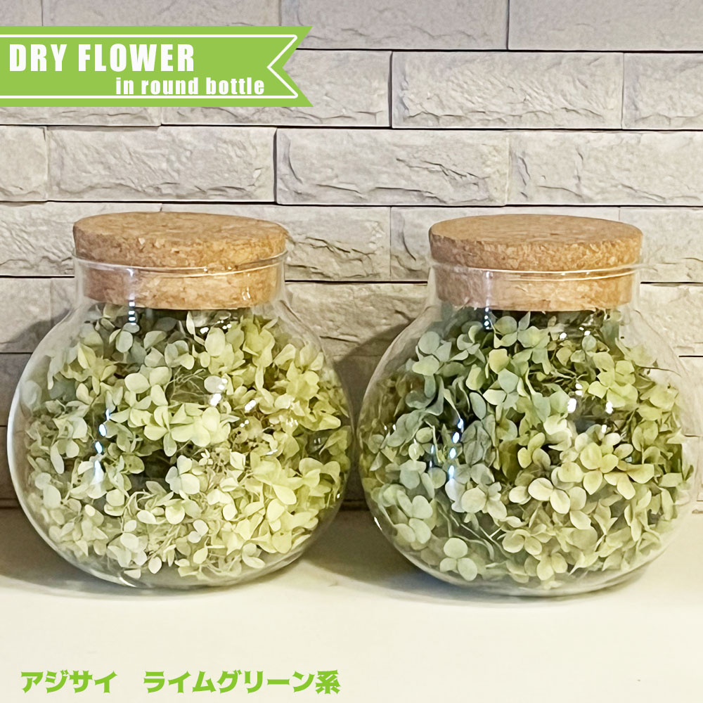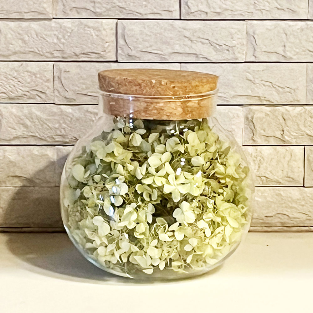 素朴なライムグリーンアジサイのドライフラワーをおしゃれなガラスボールに詰めました。置くだけで素敵なインテリアに!