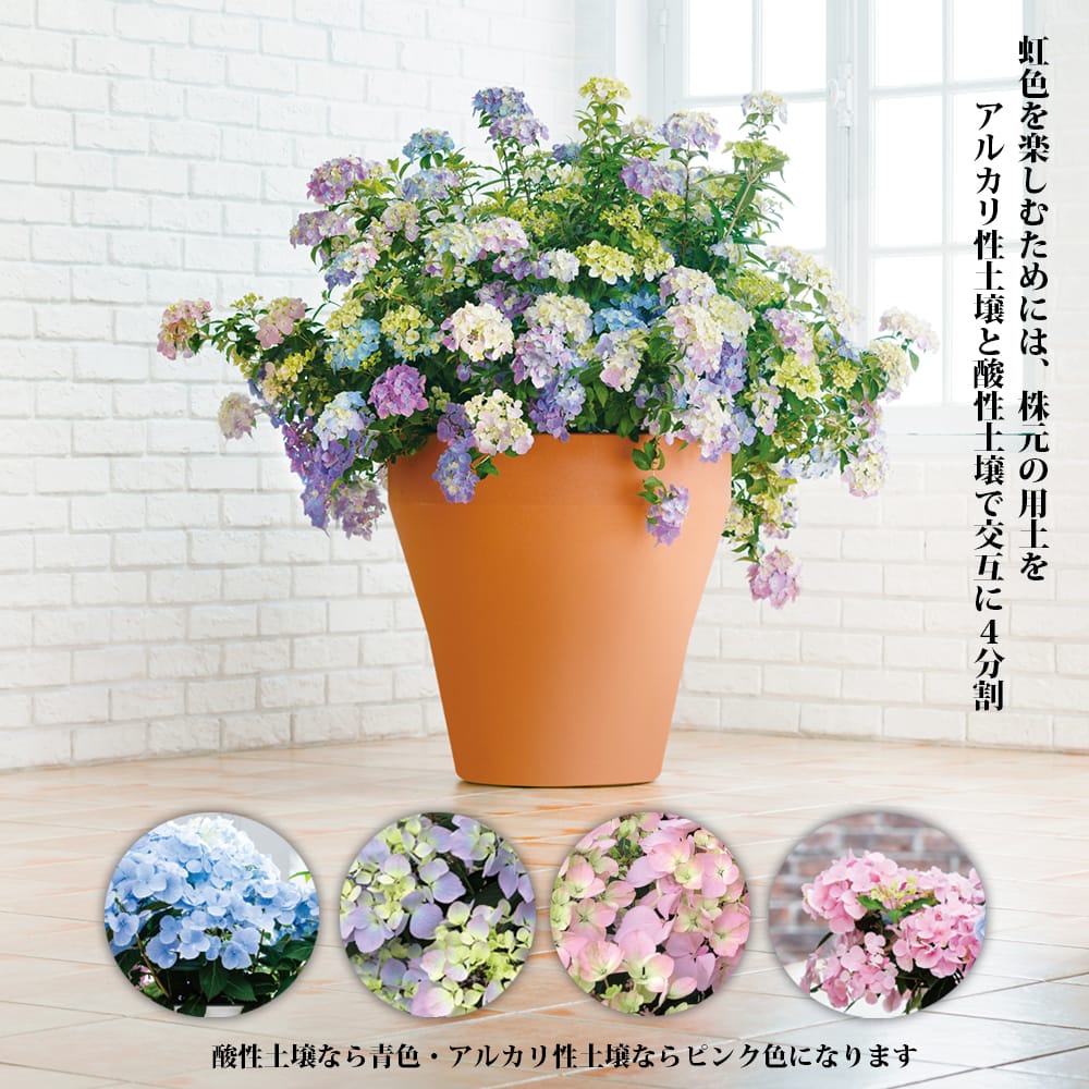 クリスタルヴェール2は1つ1つの花房もボリュームがある上に、たくさんの花を枝いっぱいに咲かせます。土壌のpHによって花色を変化させ、壮大なクリスタルの虹色ヴェールを魅せてくれます。初代クリスタルヴェール(2023年春に廃盤)が改良され、根が強くなり枝数・株のボリュームがアップしました。土壌のpHによっては、ブルー、パープル、ピンクが混ざりあい美しいグラデーションを魅せてくれます。虹色に染まる花毬があふれるように咲き満ちります。
