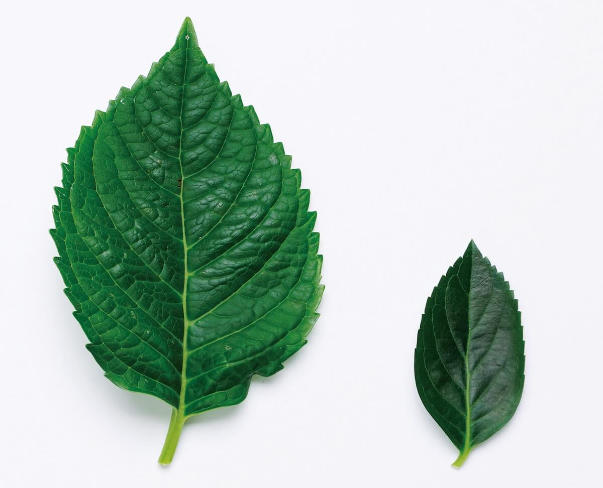 左がラグランジアの葉、右は従来のアジサイの葉切り花でも長く楽しめます。ラグランジアは茎の中にワタがなくスムーズに水揚げもします。